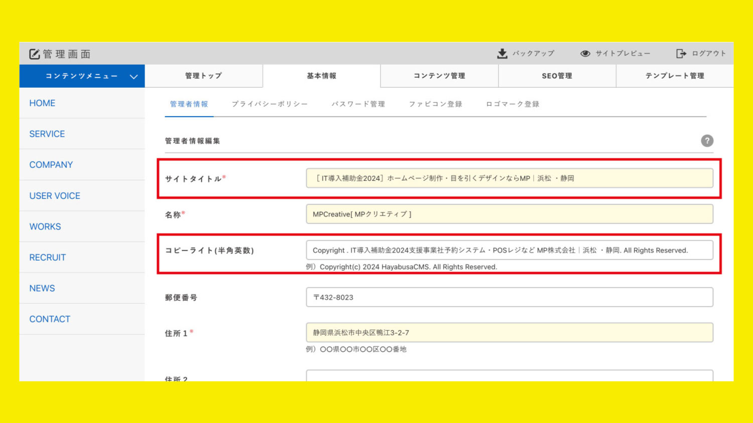 実はこの部分、管理画面から変更が可能となります。ただサイト公開年と社名を入れるだけになっている場合、