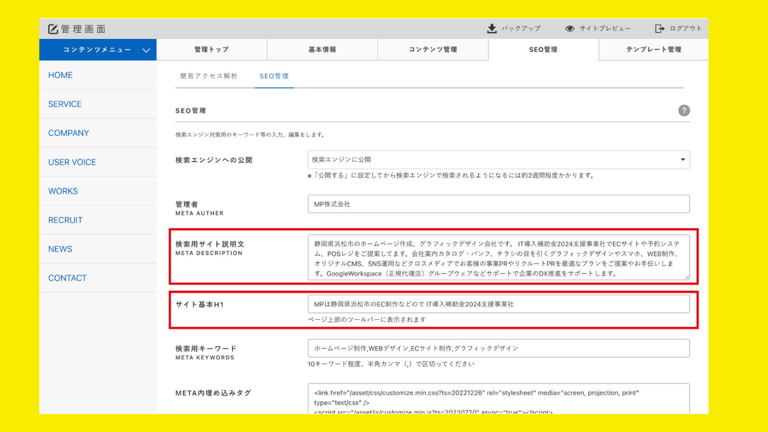 こちらは当社CMSサービスをご利用の方のほとんどがサイト上には表示されませんが、H1というのはHTMLタグで「大見出し」を指します。